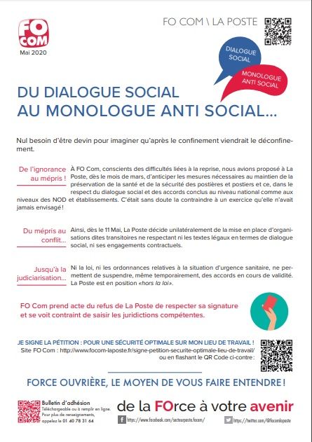 A FO Com, conscients des difficultés liées à la reprise, nous avions proposé à La Poste, dès le mois de mars, d’anticiper les mesures nécessaires au maintien de la préservation de la santé et de la sécurité des postières et postiers et ce dans le respect du dialogue social et des accords conclus au niveau national comme aux niveaux des NOD et établissements. C’était sans doute la contraindre à un exercice qu’elle n’avait jamais envisagé !