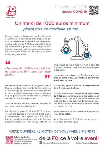 Le recentrage de l’économie sur les fonctions essentielles en période de crise met sur le de-vant de la scène les invisibles d’hier ! Mais pour combien de temps ? FO Com rappelle à ceux qui remercient aujourd’hui leur pingrerie lors des dernières négociations salariales.