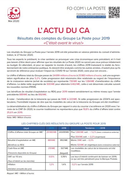 Tous les experts le prédisent, la crise sanitaire va provoquer une crise économique sans précédent, et il n’est pas besoin d’être devin pour affirmer que les résultats de La Poste 2020 ne seront pas ceux prévus initialement au budget. En attendant, et pour se rappeler le monde d’avant, les chiffres 2019 traduisent la réalité du fonctionnement de notre entreprise publique. Ils doivent être analysés comme les autres années, d’autant plus qu’ils serviront de référence pour évaluer l’impact du COVID 19 sur l’année 2020, voire plus loin encore…